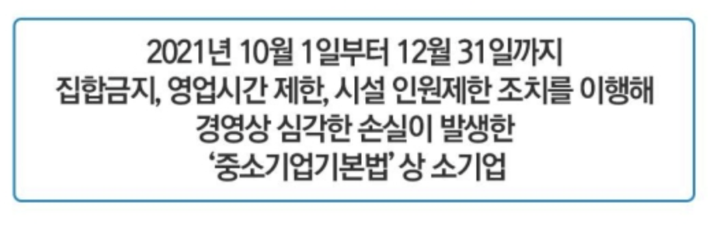 2021년 10월 1일부터 12월 31일까지 (2021년 4분기 동안) 집합금지, 영업시간 제한, 시설 인원제한 조치를 이행하여 경영상 심각한 손실이 발생한 중소기업기본법상 소기업