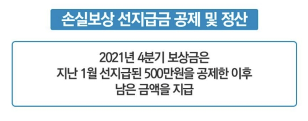 - 2021년 4분기 손실보상금이 500만원 미만이면 공제후 남은 선지급금은 2022년 1분기 보상금 지급시 추가로 공제합니다.